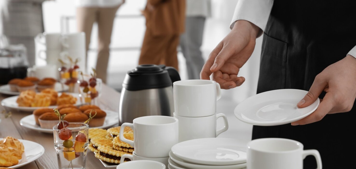 Coffee, tea, mineral water in jugs, shortbread cocktail cookies